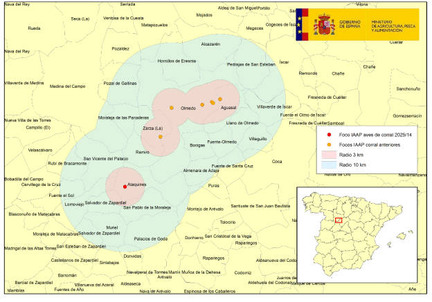 Con este caso, el número total de focos de influenza aviar detectados en aves de corral en España durante 2025 asciende a 14, localizados en las provincias de Badajoz (1), Toledo (2), Huelva (2), Guadalajara (1), Valladolid (7) y Madrid (1).