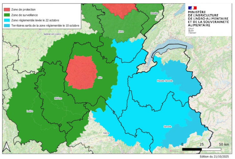 Francia ha logrado un paso decisivo hacia la erradicación de la DNC con la conversión de la primera de las cinco zonas reguladas en “zona de vacunación”, medida que se hizo efectiva el 22 de octubre. Esta zona se había establecido inicialmente el 29 de junio, tras la detección del primer brote en Saboya, y fue ampliada conforme se identificaban nuevos focos.