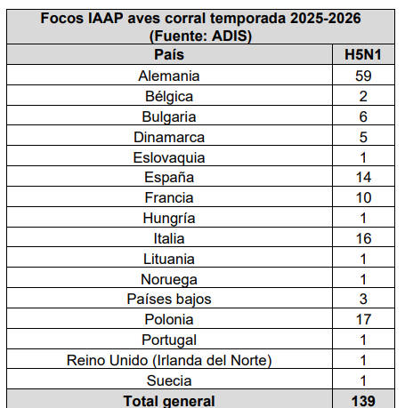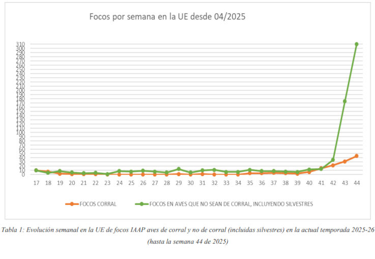 Entre el 1 de julio y el 5 de noviembre de 2025 se han comunicado a través del sistema ADIS un total de 139 focos en aves de corral, 708 en aves silvestres y 33 en aves cautivas. Los brotes se concentran principalmente en el centro y norte de Europa, aunque también se han registrado casos en la Península Ibérica, lo que ha incrementado la preocupación por una posible expansión hacia el territorio español.
