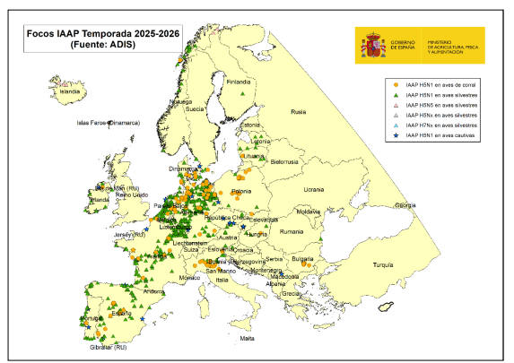 Según el mapa elaborado por el Ministerio de Agricultura, los focos de IAAP se han detectado en numerosos países europeos, con especial incidencia en Alemania, Países Bajos, Francia, Polonia y Dinamarca, así como en el norte de España y Portugal. La mayoría de los brotes corresponden al subtipo H5N1, aunque también se han identificado casos de H5N2, H5N5 y H5N8 en aves silvestres y de corral.