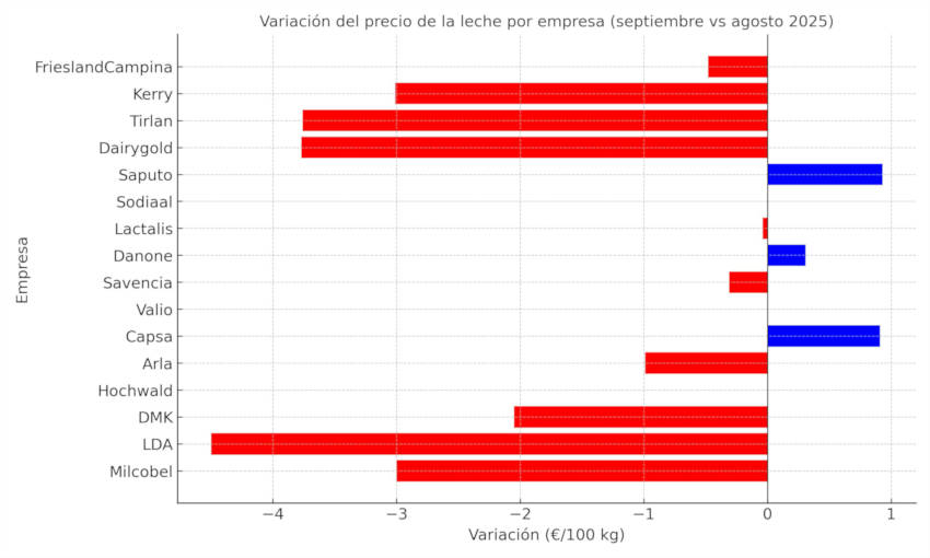En Dinamarca, Arla bajó ligeramente su precio hasta 52,67 €/100 kg, mientras que en Francia la evolución fue dispar: Savencia (-0,31 €/100 kg), Lactalis (-0,04 €/100 kg) y Danone (+0,30 €/100 kg).