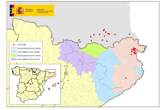 Mientras la situación española se mantiene bajo control, los SVO franceses han comunicado cinco nuevos focos desde la última actualización: cuatro en el departamento de Pirineos Orientales y uno en el departamento de Jura. Con estos casos, Francia alcanza un total de 101 focos notificados. No obstante, los nuevos focos de Pirineos Orientales no implican cambios en la zona de restricción establecida en España, que continúa vigente sin modificaciones.