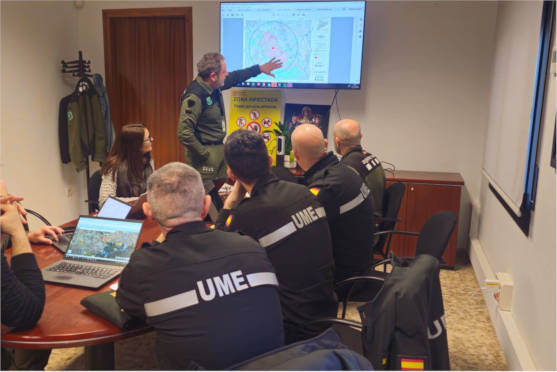 Desde la noche del domingo, los efectivos de la UME se han ido incorporando en dispositivo de control y vigilancia activos. Principalmente tienen tareas encomendadas relaciones con el control cinegético, desinfección, cálculo de la densidad de fauna con drones y soporte a la retirada en caso de detección de más cadáveres.