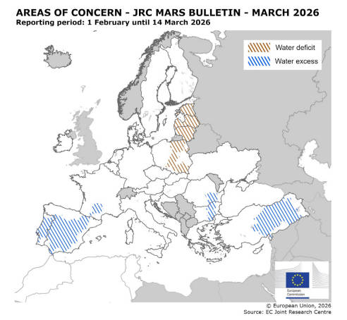 Los cultivos de invierno en Europa han iniciado la salida del letargo invernal en condiciones generalmente favorables, según el último boletín MARS publicado el 23 de marzo por el Centro Común de Investigación (JRC) de la Comisión Europea. En el caso de España, las lluvias han mejorado la disponibilidad de agua, aunque también han provocado problemas puntuales de encharcamiento en algunas zonas.