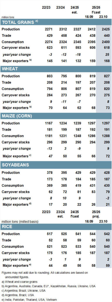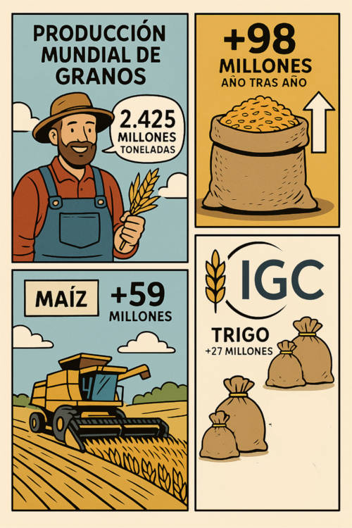 Según el último informe del Consejo Internacional de Cereales (IGC), la producción mundial total de granos (trigo y granos secundarios) para 2025/26 se elevará a 2.425 millones de toneladas, 13 millones más que el mes anterior. Se trata del tercer aumento consecutivo y refleja principalmente mejores rendimientos en trigo y cebada. Con un consumo global estimado en 2.400 millones de toneladas, las existencias finales se incrementarán en 12 millones, hasta un máximo de tres años de 618 millones. El comercio mundial también se prevé al alza, con 440 millones de toneladas, impulsado por mayores envíos de trigo.