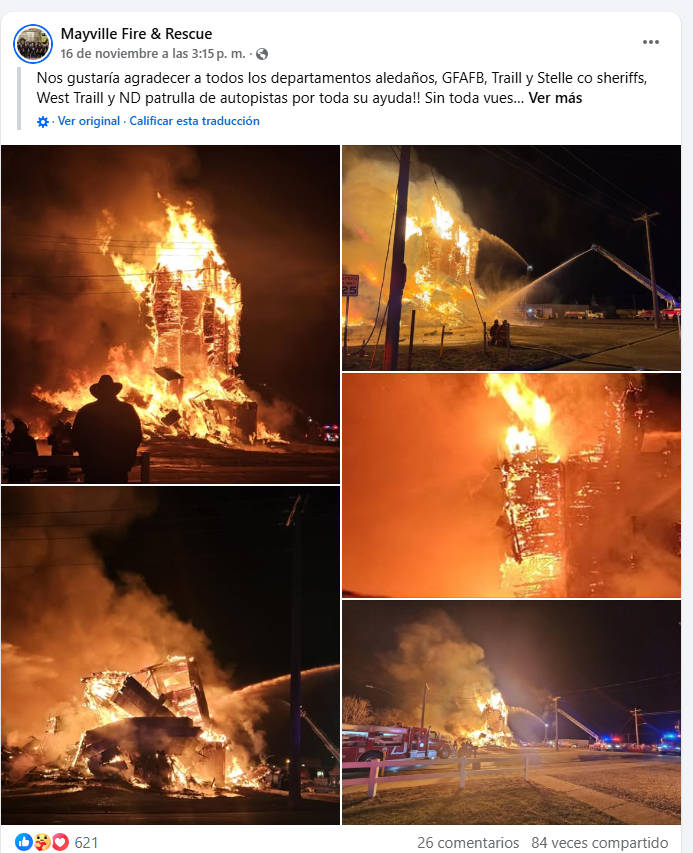 El fuego comenzó alrededor de las 19:00 horas del sábado 15 de noviembre. Durante la fase más intensa, se pudieron observar grandes llamas saliendo del edificio. Aproximadamente una hora después de iniciarse el incendio, la estructura terminó derrumbándose. El subjefe de bomberos de Mayville indicó que, pese a la magnitud del suceso, no se registraron heridos.