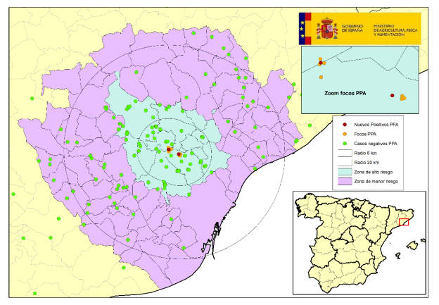 Todos los focos detectados hasta la fecha se encuentran localizados dentro de una zona de aproximadamente 30 km2 , denominada “zona core”, aislada completamente del resto de la Zona Infectada de 20 km de radio al encontrarse totalmente rodeada por los vallados de las distintas autopistas que la rodean.