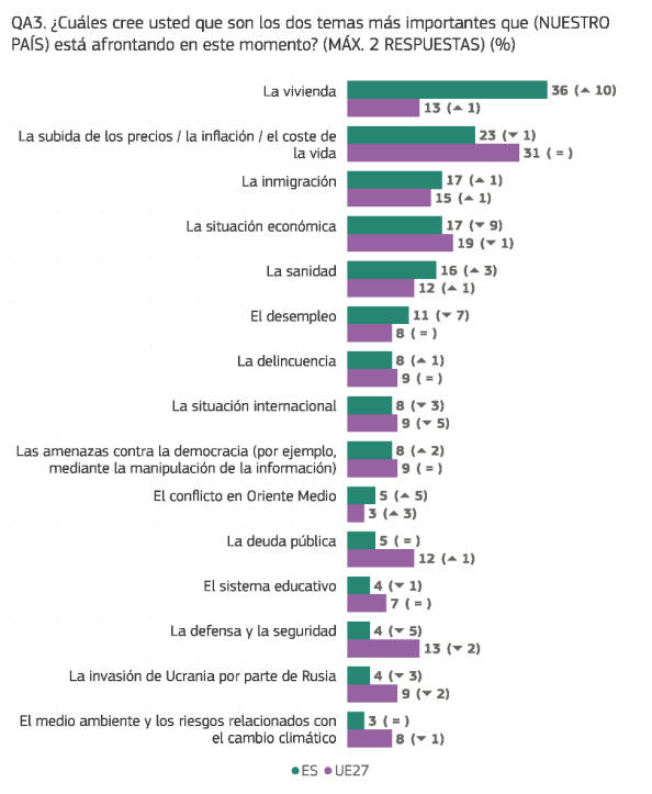 Preguntados por los dos temas más importantes que actualmente están afectando a España, las principales preocupaciones fueron la vivienda, la subida de los precios y la inmigración, por este orden de importancia. De las 15 preocupaciones que enumeraron los encuestados, ninguna se refería a la agricultura. (Quizás cuando vayamos al supermercado y no tengamos disponibilidad de alimentos ni con los estándares de calidad actuales, si que la agricultura empiece a preocuparnos, pero quizás ya sea demasiado tarde, porque los agricultores de la UE hayan ya tirado la toalla).