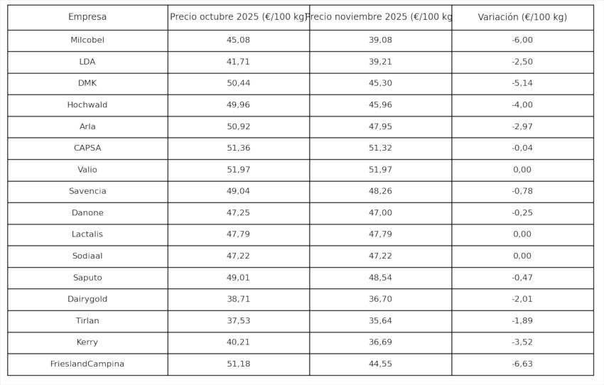 El precio medio de la leche en Europa se situó en noviembre de 2025 en 44,57€/100 kg, lo que supone un descenso del 4,8% respecto a octubre (quinta bajada mensual consecutiva) y un nivel un 11,2% inferior al de noviembre del año anterior, según el informe EDF-ZuivelNL de comparación internacional de precios.