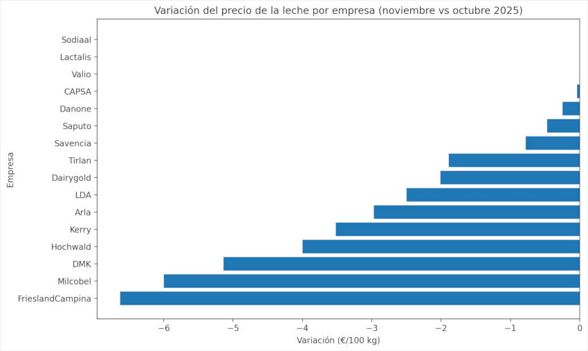 La tendencia general fue bajista en la mayoría de operadores europeos, con descensos especialmente marcados en Bélgica, Alemania y Países Bajos. El informe atribuye esta evolución, en términos generales, a un elevado nivel de oferta de leche, además de ajustes a la baja en los valores pagados por grasa y proteína en varios mercados.
