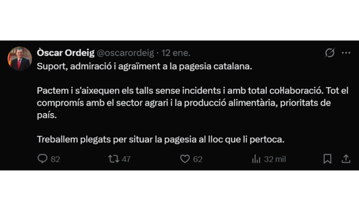 El acuerdo Govern y Revolta Pagesa en Cataluña ha llevado a la desconvocatoria de los cortes y bloqueos que se venían registrando en los últimos días. El pacto se cerró tras una reunión celebrada el lunes 12 de enero y fija una hoja de ruta con medidas presupuestarias, mesas de trabajo y seguimiento.