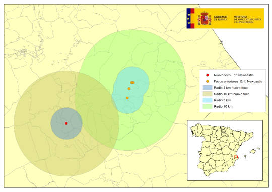 - Establecimiento de una zona de restricción alrededor del foco. En la zona de 3 km no hay granjas comerciales, y en radio 3-10 km hay 13 granjas comerciales (6 de ellas ya incluidas en la zona de restricción establecida por los anteriores focos).