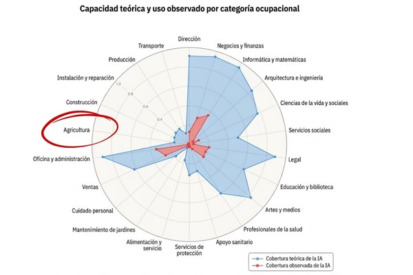 Ese resultado, aun así, conviene leerlo con cautela. Los estudios clasifican tareas y ocupaciones con la base estadounidense O*NET, no sectores económicos completos. Por eso, una parte de la actividad agraria vinculada a gestión, administración, finanzas, documentación o dirección puede no aparecer bajo la etiqueta de agricultura, pesca y silvicultura, sino repartida en otras familias ocupacionales que sí tienen más peso en el tráfico analizado por Anthropic. Lo que sí indica con claridad esta fotografía es que la ocupación agraria en sentido estricto aparece poco en el uso observado de Claude frente a otras profesiones más intensivas en información.